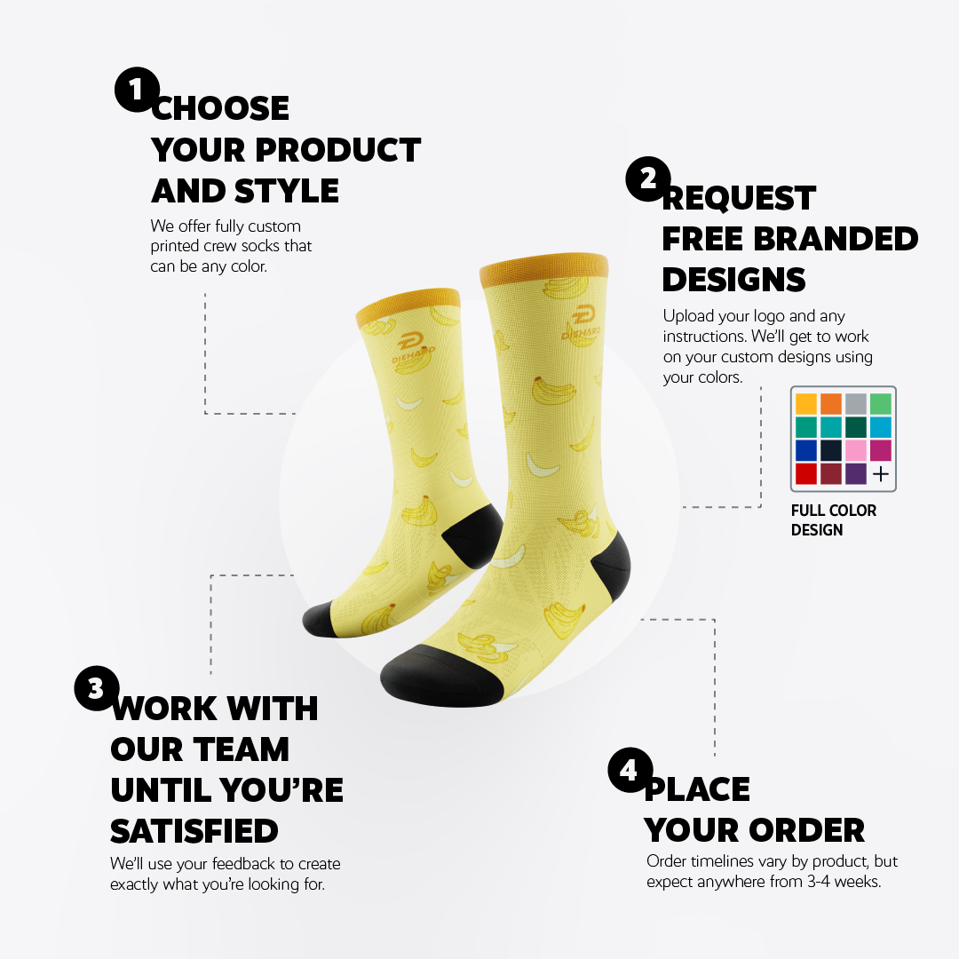 Experience unparalleled comfort with ultra-plush padding, vented combed cotton, and a compression rating of 16.4mmHg, making this sock the ideal choice for those on their feet. This sock is carried in Nordstrom, Dicks Sporting Goods, Target and many fine retailers. It has a selection of 2 different woven base colors, and a fully customizable sublimated 3.5"x 4.5" design space on the calf. Discover the ultimate in athletic performance and personalized style with our premium athletic ankle sock.